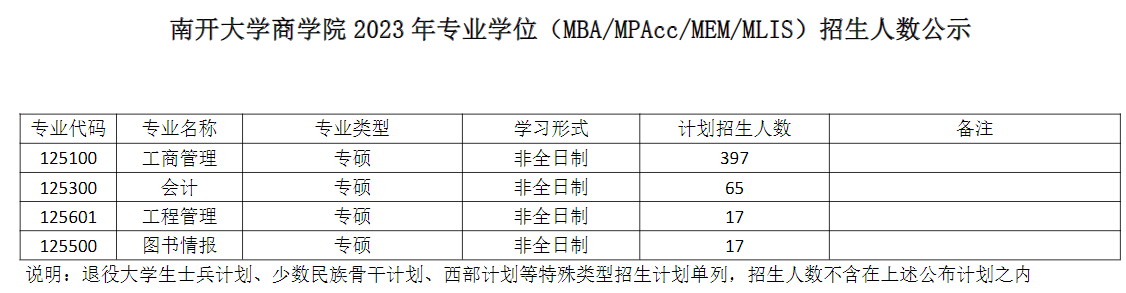 南开大学商学院2023年专业学位(含MBA-MPAcc-MEM-MLIS)考研招生人数公示