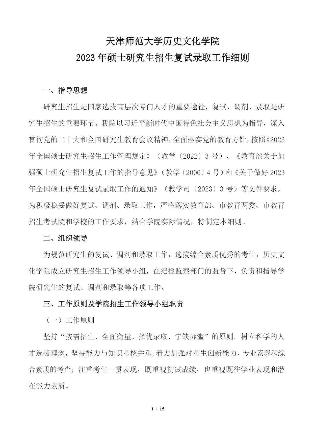 天津师范大学历史文化学院2023年硕士研究生考研复试、录取工作细则