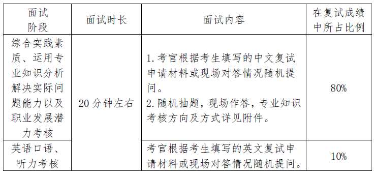 面试分两个阶段,分别为:综合实践素质、运用专业知识分析解决实际问题能力以及职业发展潜力考核;英语口语、听力考核。