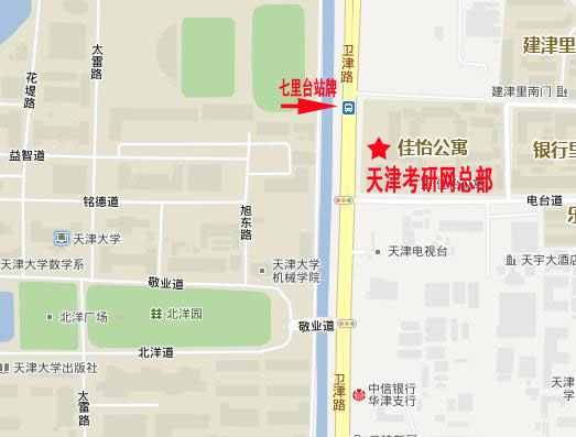 天津考研网总部位于和平区卫津路佳怡国际D-2-808,毗邻天津大学东门,乘公交的话做到七里台站,站牌旁边有座佳怡国际,总部便在此。天津考研网致力于天津地区各高校的考研辅导与咨询,涉及各专业的专业课f辅导考研资料。天津考研网拥有多年的考研专业课咨询、辅导经验,资料齐全,内容权威,值得考研学子的信赖。