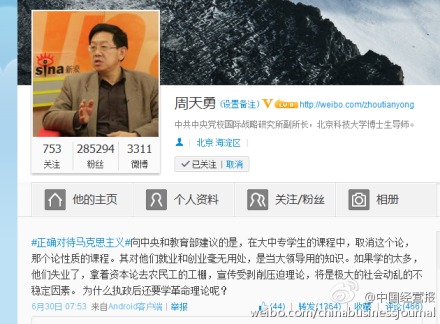 中央党校教授周天勇发微博建议:在大中专学生课程中取消这个论,那个论性质的课程。其对他们就业和创业毫无用处,是当大领导用的知识。如果学太多,他们失业了,拿着资本论去农民工的工棚,宣传受剥削压迫理论,将是极大社会动乱的不稳定因素。 为什么执政后还要学革命理论?