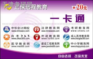 说明:为方便广大学员购买考研网校课程,特推出考研网校学习卡(共分50、100、200三种面值)和正保远程教育一卡通(共分10、20、50、100、120、150、200、500元八种面值),每张学习卡/一卡通都有不同的卡号,学员在购买学习卡/一卡通后,刮开卡号覆盖层,进入考研网校,注册学员代码和密码、然后用已注册的学员代码和密码登录考研网校,选择所要学习的课程(也可以在充值后选择)、输入学习卡/一卡通的卡号(如有多张可依次输入,直到充完为止)、学习卡充值完毕、点击“学习卡/一卡通支付”划拨课程费用、等确认支付成功后,用已注册的学员代码和密码登录考研网校点击所报课程开始学习。