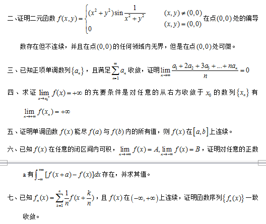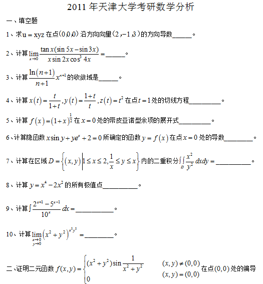 天津大学考研数学分析考研真题(2011年部分摘录):