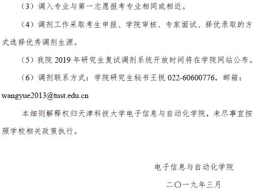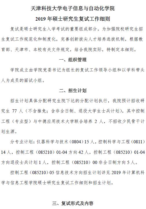 2019年天津科技大学电子信息与自动化学院考研复试细则公示