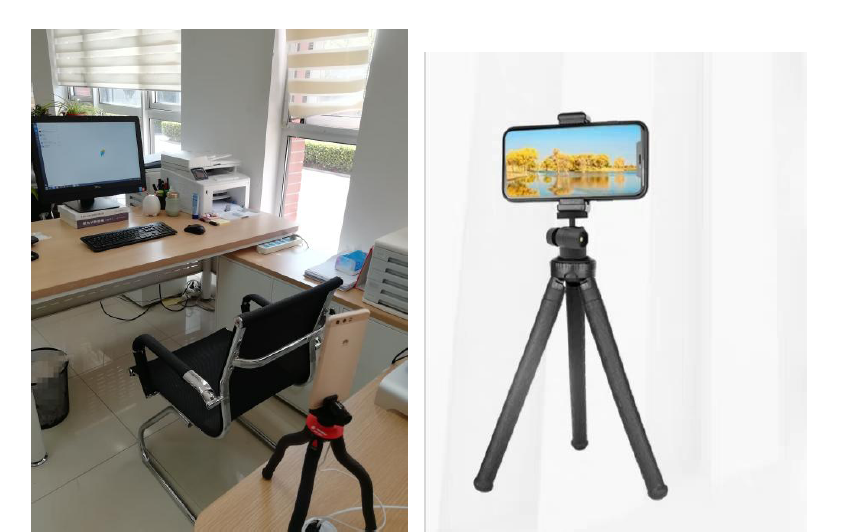 背面:调整手机固定支架,保证考生和电脑屏幕画面在手机端界面。测试时最佳摆放角度在30°~ 45°。若使用备用软件飞书进行面试,进入面试界面后,由于电脑端和手机端同时登陆飞书账号,且距离较近,同时进入会议会形成电波干扰,出现刺耳的杂音,因此建议考生在进入会议前将手机插上耳机,或者在进入会议后,及时关闭手机端的麦克风。需注意:通过电脑关闭手机端麦克风会同时关闭电脑端麦克风,通过手机关闭麦克风不会对电脑端麦克风造成影响。