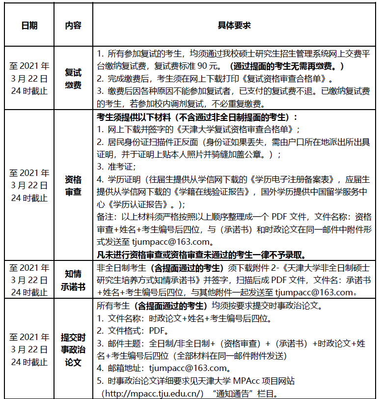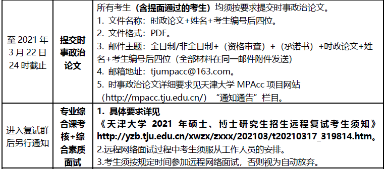 特别提示:符合教育部认可或备案“大学生志愿服务西部计划”、“三支一扶计划”、“农村义务教育阶段学校教师特设岗位计划”、“赴外汉语教师志愿者”、“选聘高校毕业生到村任职”等项目加分政策的考生,须在3月22日24时前向MPAcc招生办公室提供相关证明材料,证明材料须整理成一个PDF文件,文件名称:加分类别+初试成绩+考生姓名,请用网报时的邮箱以附件形式与资格审查材料、承诺书、时政论文等一起发送至邮箱