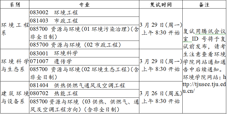 天津大学环境科学与工程学院2021年考研复试录取办法(含非全日制)根据教育部有关招生录取文件精神,结合我校研究生招生工作的实际情况,现将我院2021年硕士研究生招生复试、录取和调剂工作安排如下。一、组织领导1、学院组成院级研究生招生工作领导小组,领导小组应由学院党委书记、院长、主管研究生工作的副院长、纪检工作负责人、分管学生工作的党委副书记及相关人员组成,负责制定复试工作具体方案并组织实施,指导复试小组进行具体考查工作,同时负责处理招生过程中考生提出的质疑和申诉。2、复试小组的组成及要求学院根据本院各学科、专业的实际情况,成立若干复试小组,每个小组总人数不少于5人(其中研究生指导教师不少于3人),负责实施对考生的身份识别、专业能力和综合素质考核,小组成员现场独立评分,评分记录和考生作答情况交研究生院集中统一保管,任何人不得改动。复试小组设组长1名,组长一般应由教授担任,负责本小组的复试工作。复试小组的组成应由学院研究生招生工作领导小组审定,报学校研究生招生工作领导小组备案。3、学院复试工作将由校级教学督导组和校级招生复试工作检查小组负责在招生复试中各个环节进行监督和检查,保证硕士生复试录取工作的公平、公正、公开。二、工作原则1、坚持复试的科学性。采用综合性、多元化的考查方式,积极探索高层次专业人才选拔规律,使拔尖创新人才能够脱颖而出。2、全面考查,有所侧重。在德智体能等各方面全面衡量的基础上,注重对专业能力和综合素质的考核,注重对思想政治素质和身心健康状况的考核。3、综合评价,成绩量化。专业能力和综合素质考核都要有量化结果。4、坚持公开公正公平原则。复试过程做到政策透明、程序公正、操作公开、监督机制健全。5、以人为本,服务考生。提高服务意识,维护考生的合法权益。三、复试工作(一)招生规模学院本年度统考生共计招生全日制85 人,各专业拟招生计划如下: 注:以上为初分计划,学院有权视复试情况调整招生计划。(二)资格审查所有列入我院-复试名单的考生,均须通过硕士招生管理系统网上交费平台(http://202.113.8.92/TGSR/index.action)及时缴费,复试费标准为90元。完成缴费后,考生可适时在网上下载打印《天津大学复试资格审查合格单》。资格审查所需材料清单如下:1、《天津大学复试资格审查合格单》;2、本科成绩单;3、身份证;4、学历证明(往届生提供从学信网下载的电子版《学历电子注册备案表》,应届生提供从学信网下载的电子版《学籍在线验证报告》);5、电子简历(仅限1页,内容由考生自定);6、PPT(仅限1页,内容由考生自定)。以上材料均需提交清晰版扫描件并将上述材料合并成1个pdf文件,文件及邮件名称命名格式:“2021硕士复试-姓名-报考专业-研究方向(仅限专业学位考生填写)-资审材料”,于3月24日前发送至学院指定邮箱见下表,进行资格审查。 特别提示:1、身份证如果丢失,可提交有效期内的临时身份证或公安部门开具的户籍证明(带照片)。2、缴费后因各种原因不能参加复试者,已支付的复试费不退。已经缴纳复试费的考生,参加校内调剂复试不必重复缴费。3、是否可参加复试详见各报考学院网上复试名单。4、复试结束后,凡未进行资格审查或资格审查未通过的考生一律不予录取。(三)复试内容复试内容包括专业能力考核、综合素质考核两部分。专业能力考核包括外语听说能力测试和专业课测试;综合素质考核包括实验(实践)能力测试和综合面试。1、外语听说测试:以面试形式进行,主要考察考生专业外语的听、说、读、译的能力。环境科学与生态系考生须对现场随机抽取的题目作答,同时还需要对评委现场提问引申出的专业英语问题作答。环境工程系、建筑环境与设备系考生该环节为现场问答方式。2、专业课测试:主要测试考生专业素质和专业能力,以及对专业骨干课程的掌握情况。面试形式进行,环境工程系、建筑环境与设备系考生该环节含现场抽题作答,环境科学与生态系考生该环节为双语测试。3、实验(实践)能力测试:需要学生掌握相关专业领域涉及的基本实验技能,对一些基本实验操作及实验技能进行作答。以面试形式进行,主要测试其实验操作技能,报考环境工程系、建筑环境与设备系相关学科考生有现场抽题作答。4、综合面试:考核内容应涉及考生思想政治素质和道德品质考核,考生的创新精神和创新能力考核,考生理论知识和应用技能掌握程度、利用所学理论发现、分析和解决问题的能力考核,考生对报考专业发展动态了解以及在本专业发展潜力考核;考生的科研和社会工作能力、实践经历考核,考生的事业心、责任感、协作性和心理素质以及举止礼仪和表达能力考核等。考核形式为面试形式。面试全程由各专业复试小组负责考核,面试成绩由每位复试小组成员独立给出分数,然后取算术平均值得出。每个考生总计面试时长一般为30分钟左右,具体时间可由面试专家组根据面试情况适当调整。(四)复试规则由各学科根据招生规模确定复试比例及名单分数线,比例一般不低于120%。对合格生源不足120%的学科、专业按实际合格考生名单组织复试。后续将在学院网站公布复试名单。2.复试评分及成绩复试成绩总分200,其中专业能力考核80分,综合素质考核120分。专业能力考核成