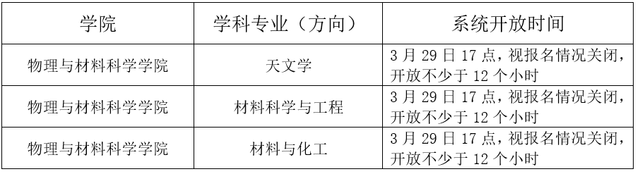 天津师范大学物理材料科学学院2021年考研调剂系统开放时间(第二批)2021年天津师范大学硕士研究生招生调剂系统报名开放时间公告——物理与材料科学学院(第二批)2021-03-29 各位考生:我校部分学院的部分专业(见下表)接收调剂考生报名,现对调剂报名系统的开放时间公告如下: 待以上各专业此批次报名结束后,相关学院统一审核申请调剂考生信息,请考生耐心等待。