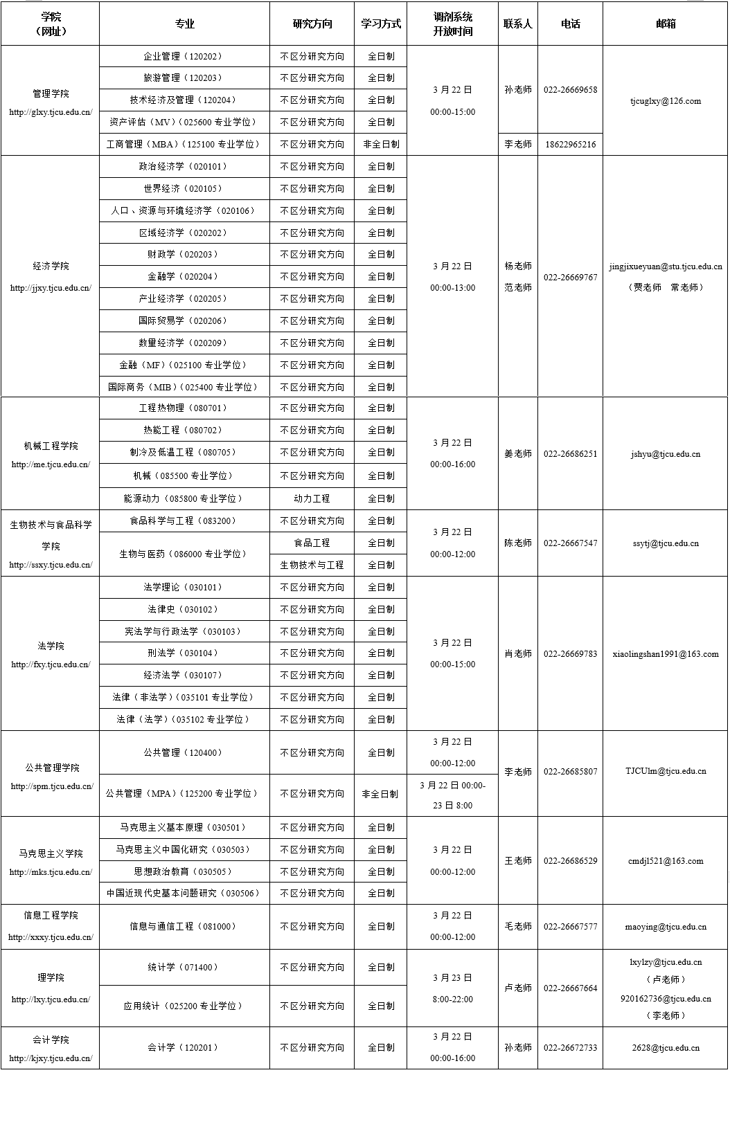 我校于2021年3月22日00:00起开通调剂系统,各学院接收调剂专业、调剂系统开放时间及联系方式见附表。非全日制专业原则上只招收在职定向人员。调剂专业缺额信息将通过“全国硕士生招生调剂服务系统” (http://yz.chsi.com.cn)(以下简称“调剂系统”)向考生公布,以调剂系统公布为准。有意愿调剂我校的考生,在“全国硕士生招生调剂服务系统”填报调剂志愿申请,如有疑问请咨询相关学院。