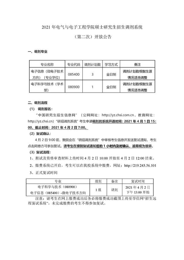 天津工业大学电气与电子工程学院2021年硕士研究生招生调剂系统(第二次)开放公告[2021-04-01]