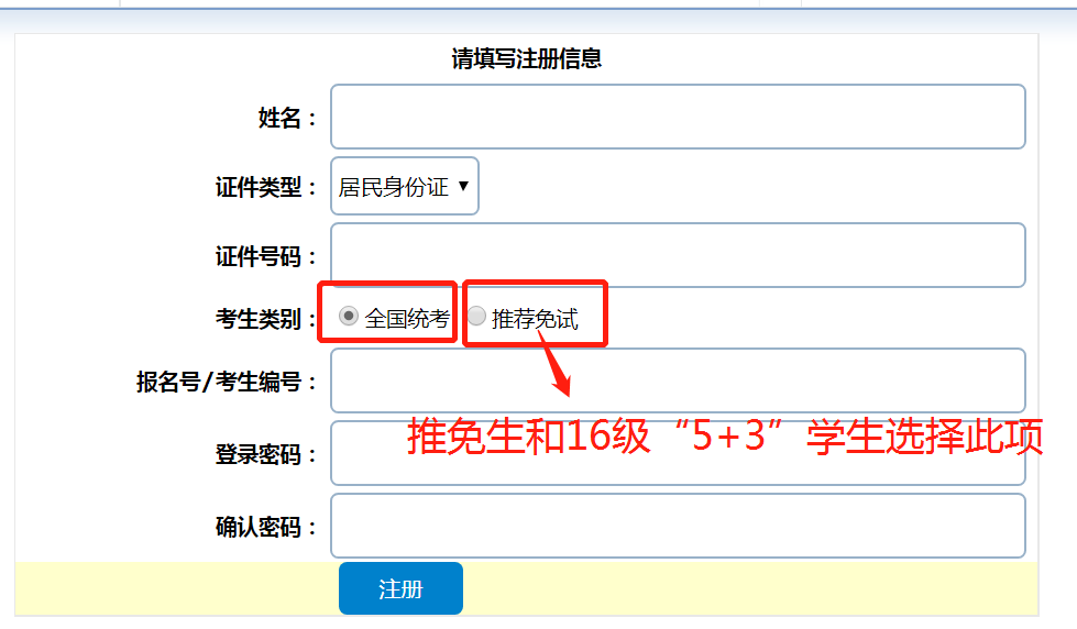 首次登陆查询系统考生需要先进行注册:点击硕士考生查询系统-点击注册-填入基本信息(其中考生类别统招生选择全国统考,推免生和16级“5+3”一体化学生选择推荐免试选项)-注册后登录
