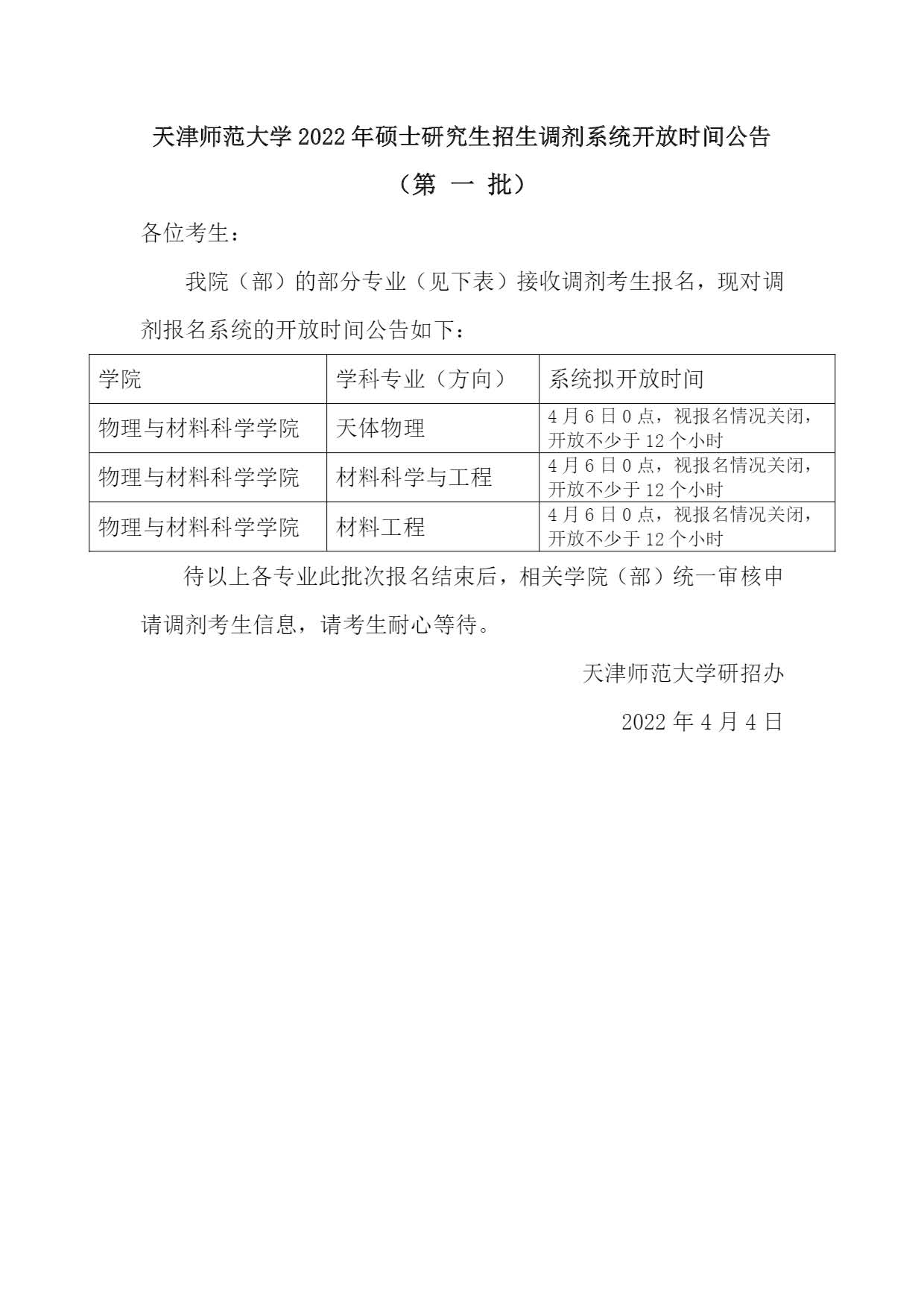 天津师范大学物理学院2022年考研硕士研究生招生调剂系统开放时间公告(第一批)