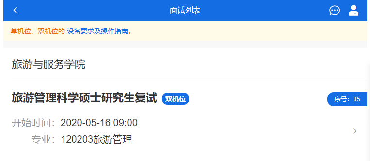 1. 考生登录系统后,完成交费、材料审核后,可选择相对应的考场(2022 年旅游管理科学硕士复试/2022 年旅游管理专业硕士全日制 MTA 复试/2022 年旅游管理专业硕士非全日制 MTA 复试),点击进入考场。