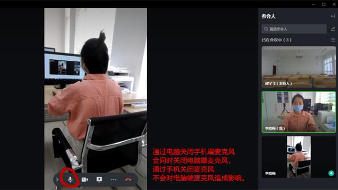 7. 由于电脑端和手机端同时登录学信网或飞书账号,且距离较近,同时进入会议会形成电波干扰,出现刺耳的杂音,因此建议考生在进入会议前将手机插上耳机,或者 在进入会议后,及时关闭手机端的麦克风。