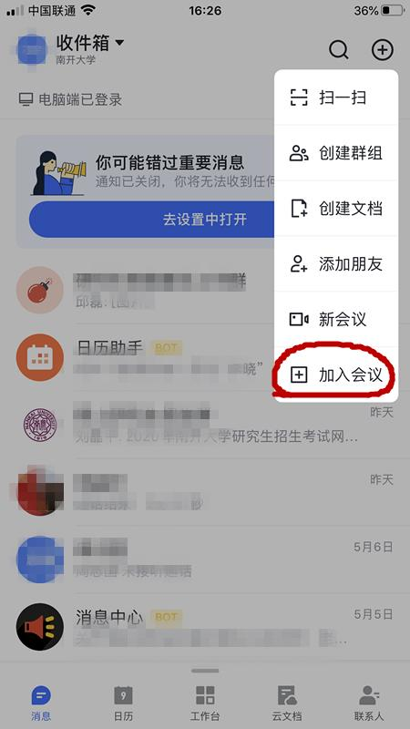 8. 学信网面试测试合格后用电脑登录飞书软件(也可以提前登录),登录后会在右上角看到会议提醒,或者点击左边日历,找到对应日期的会议,点击进入。