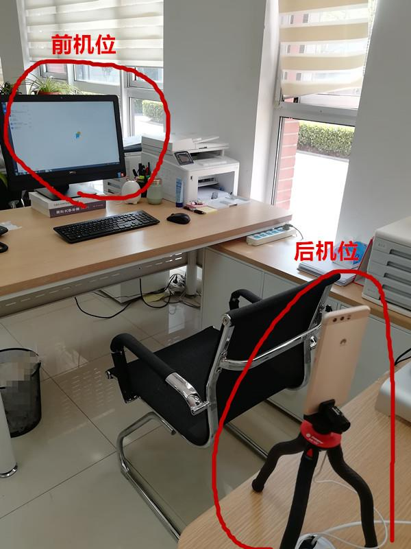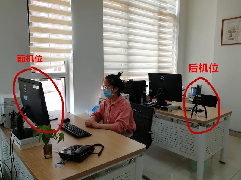 2. 复试时前机位为主机位摄像头,距离适中;后机位从左侧后方对着考生、前机位画面为考生前方,保持坐姿端正。考生 双手应出现在 前机位 画面中 ,电脑屏幕应出现在二机位画面中 。