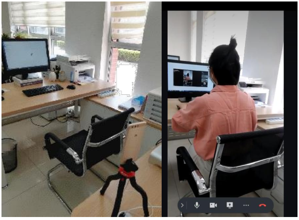 正面:调整电脑角度和座椅位置,保证双手在屏幕内。可在开始面试前和家人、朋友提前演示,固定最佳位置。