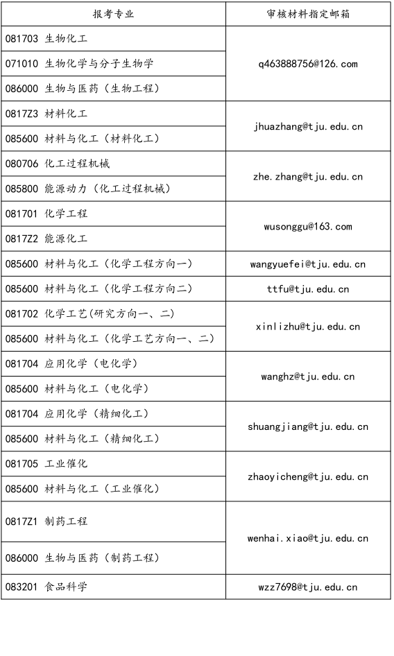 请将上述资格审查材料按清单顺序将材料整理成一个 PDF 文档,命名为“报考专业名称+专业方向名称+姓名+联系电话+确认参加复试”,并按报考专业将其发送到以下审核材料指定邮箱,邮件主题名同文件名并同时抄送学院招生邮箱tjuhgxy2023@126.com,截止时间 2023 年 3 月 21 日 24 时。