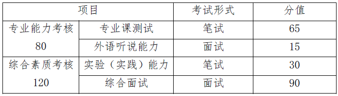 复试成绩总分200,其中专业能力考核80分,综合素质考核120分。专业能力考核成绩包括外语听说能力测试15分、专业课测试65分;综合素质考核成绩包括实验(实践)能力测试30分、综合面试90分。