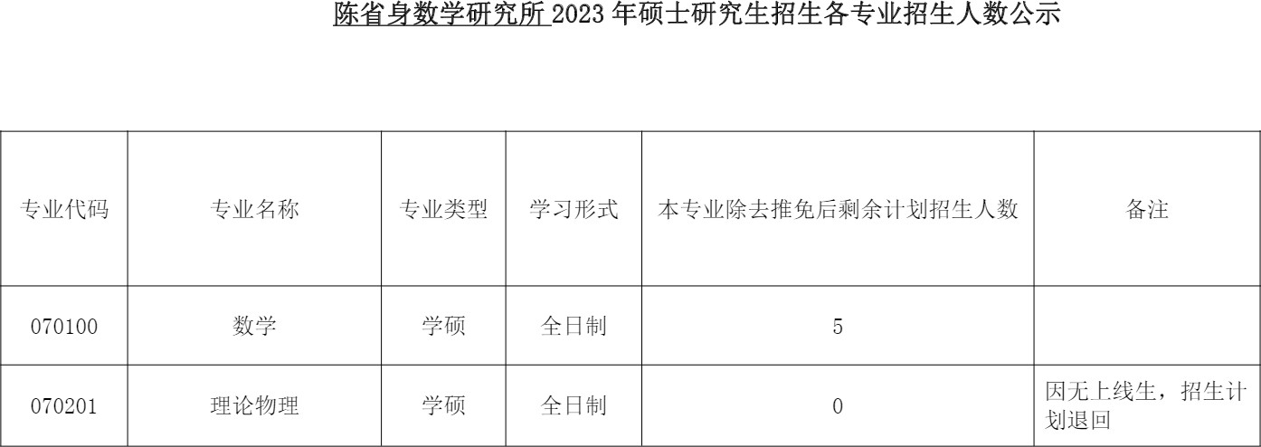 南开大学陈省身数学研究所2023年硕士研究生招生各专业考研招生人数公示