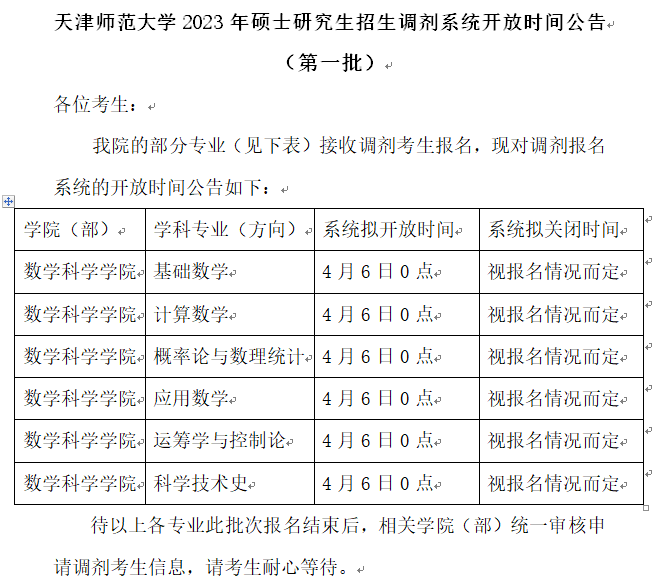 天津师范大学数学科学学院2023年硕士研究生招生考研调剂系统开放时间公告(第一批)