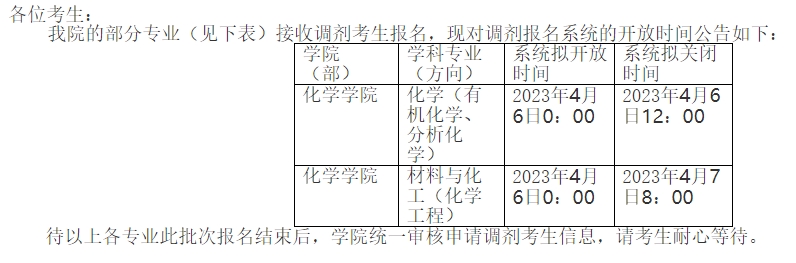天津师范大学化学学院2023年硕士研究生考研招生考研调剂系统开放时间公告(第一批)
