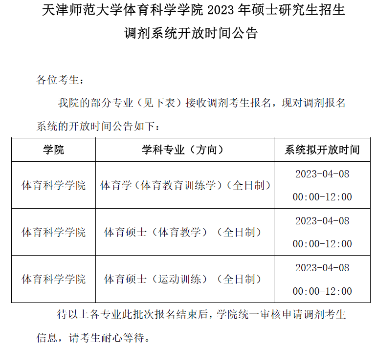 天津师范大学体育科学学院2023年硕士研究生招生考研调剂系统开放时间公告