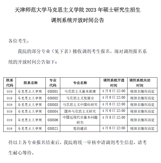 天津师范大学马克思主义学院2023年硕士研究生招生考研调剂系统开放时间公告