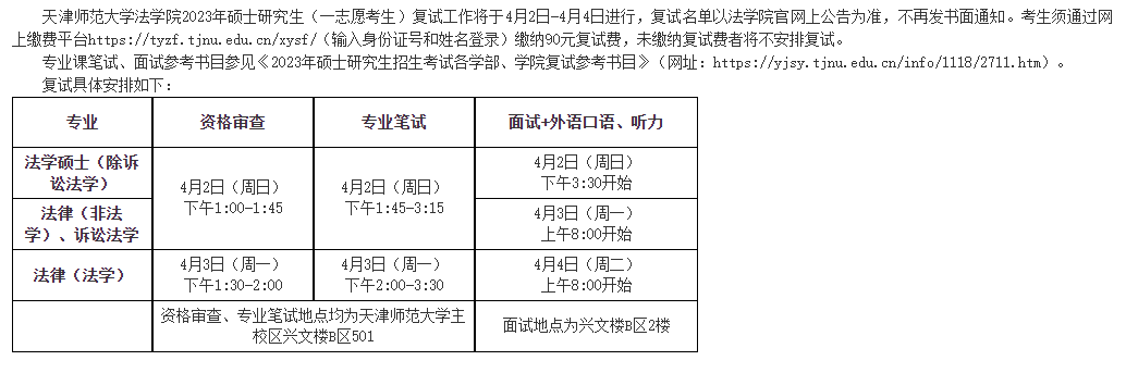 天津师范大学2023年法学院硕士研究生(一志愿考生)考研复试通知