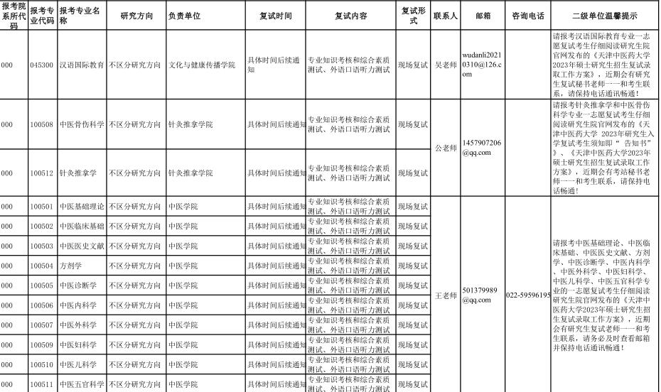 天津中医药大学2023年硕士研究生一志愿考生复试安排表、各学院附院联系方式以及温馨提示(一)