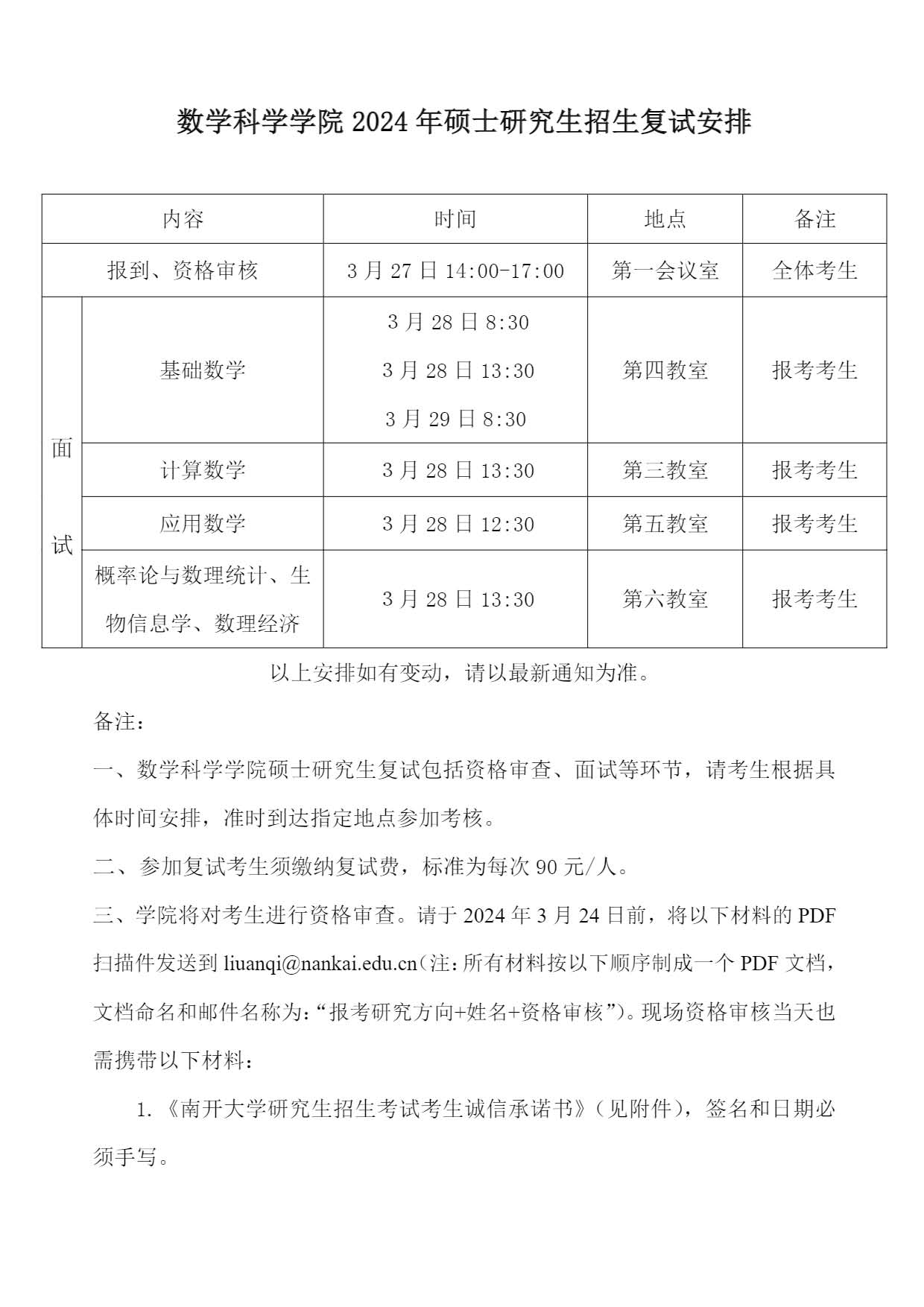 南开大学数学科学学院2024年硕士研究生招生复试安排