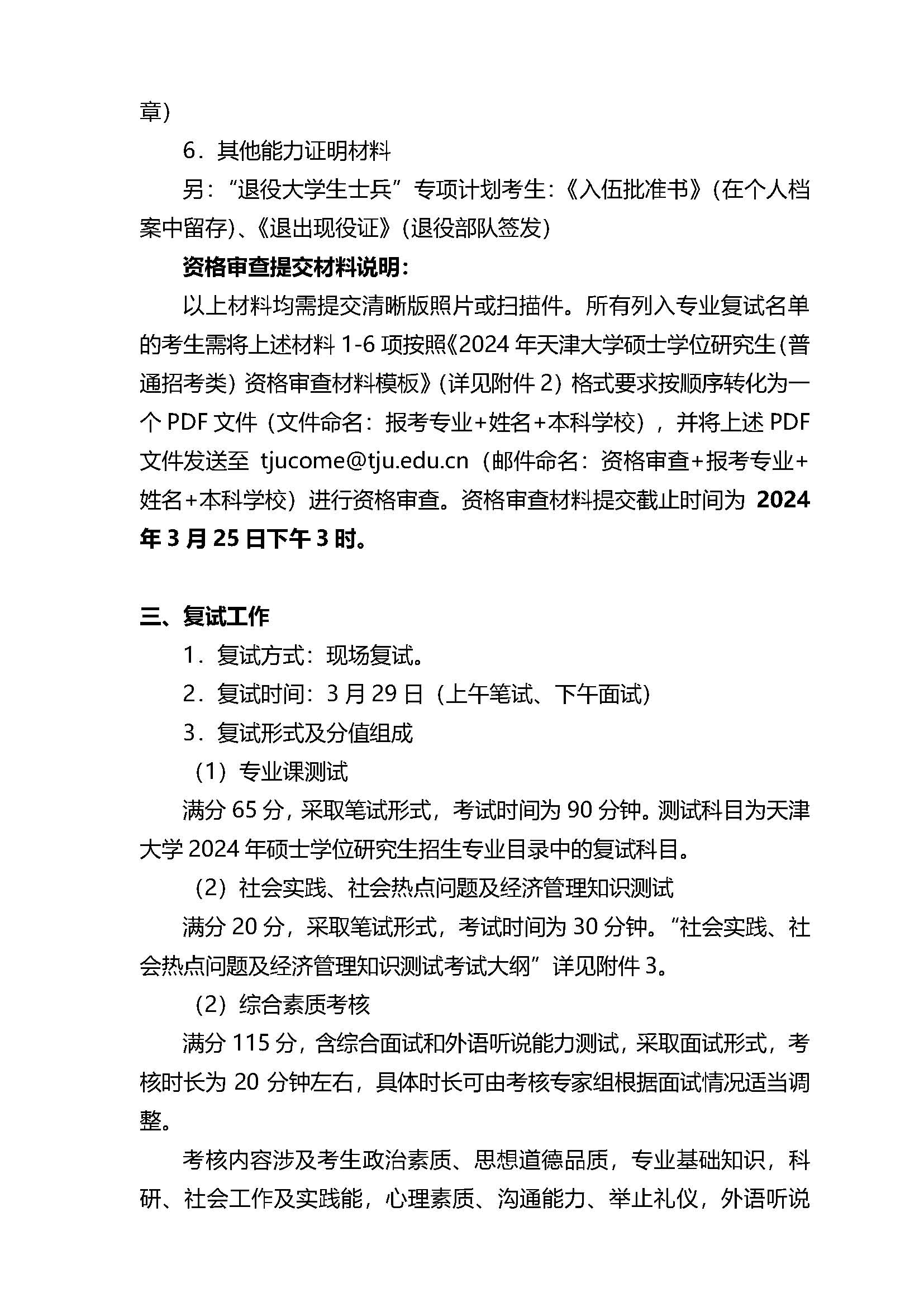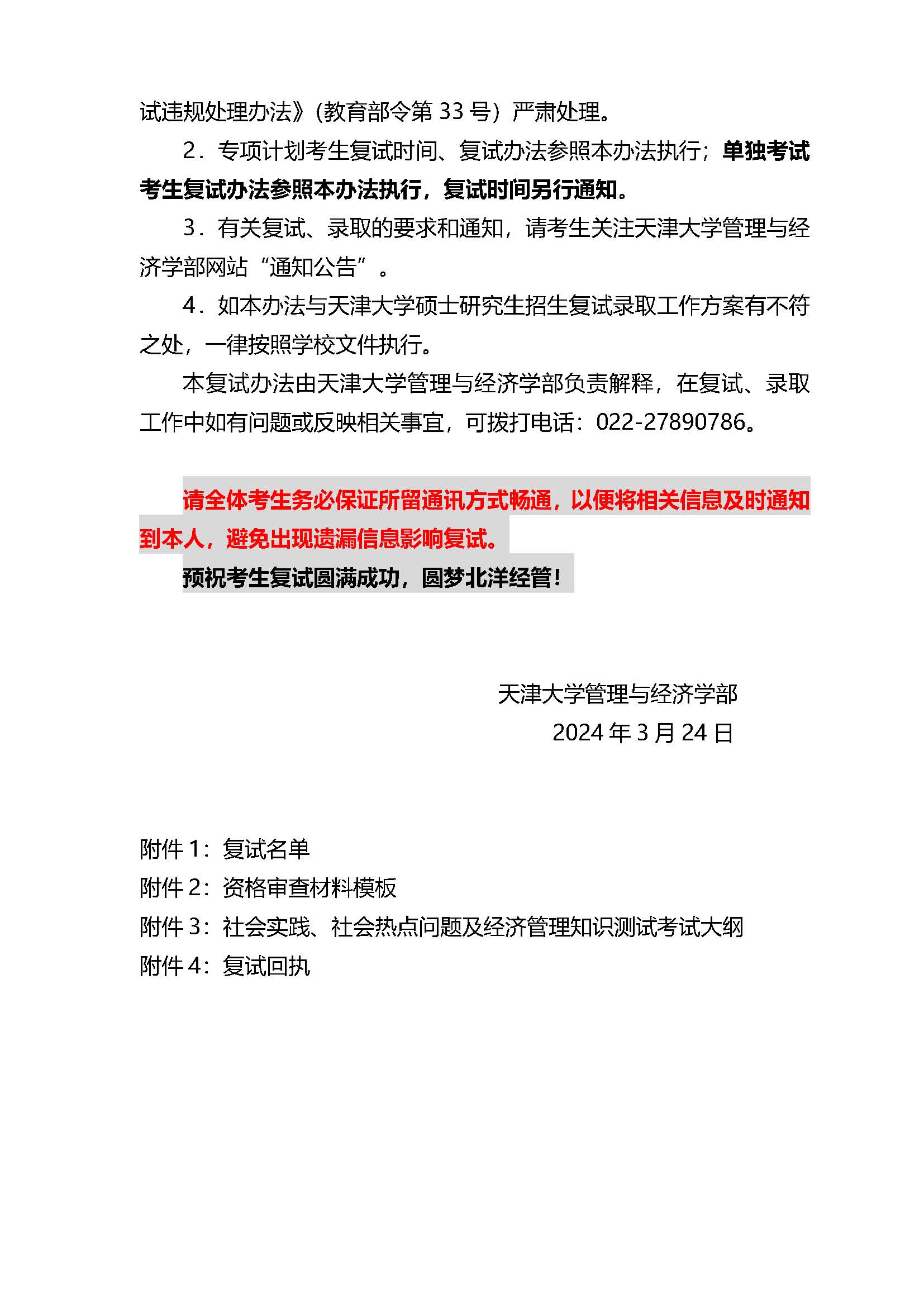 天津大学管理与经济学部2024年硕士研究生招生复试工作办法