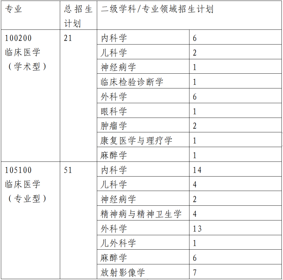 天津大学医学院2024年硕士研究生临床医学(100200、105100)二级学科/方向领域招生计划