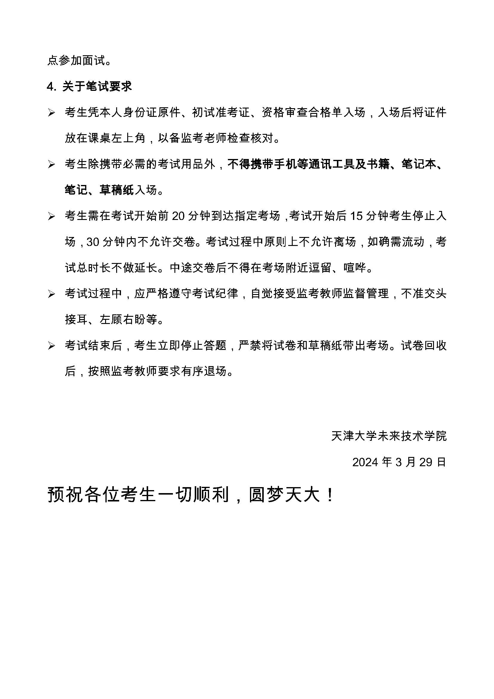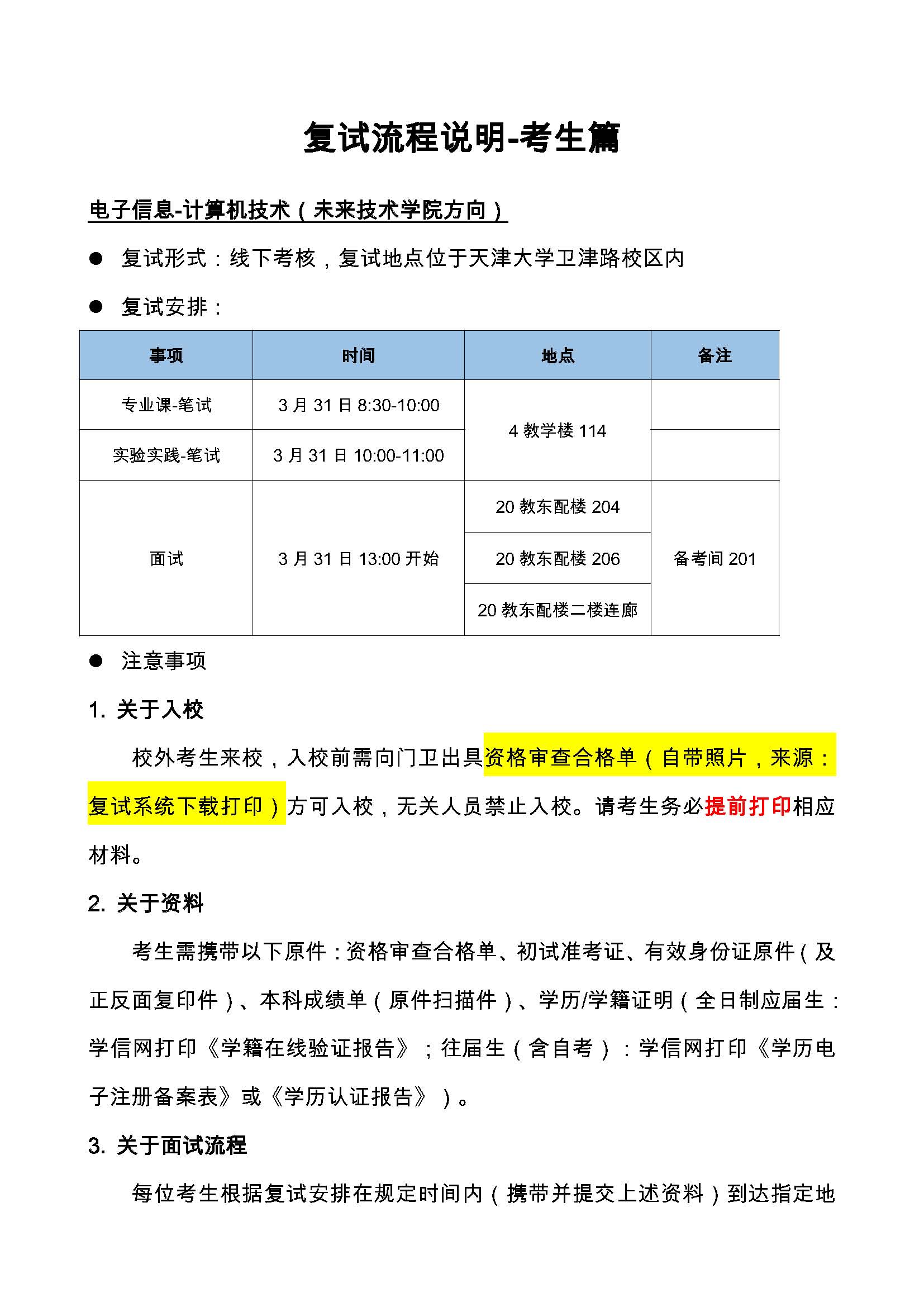 天津大学未来技术学院2024年招生复试流程安排(计算机技术专业)