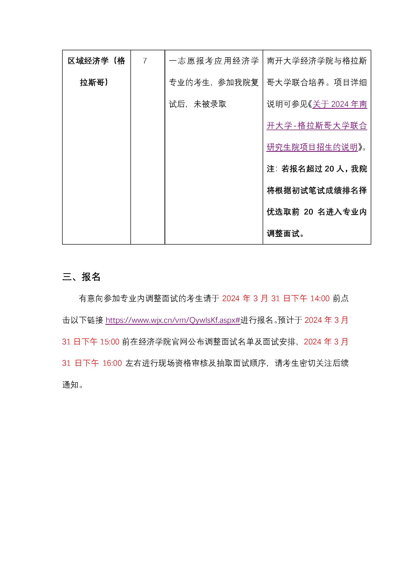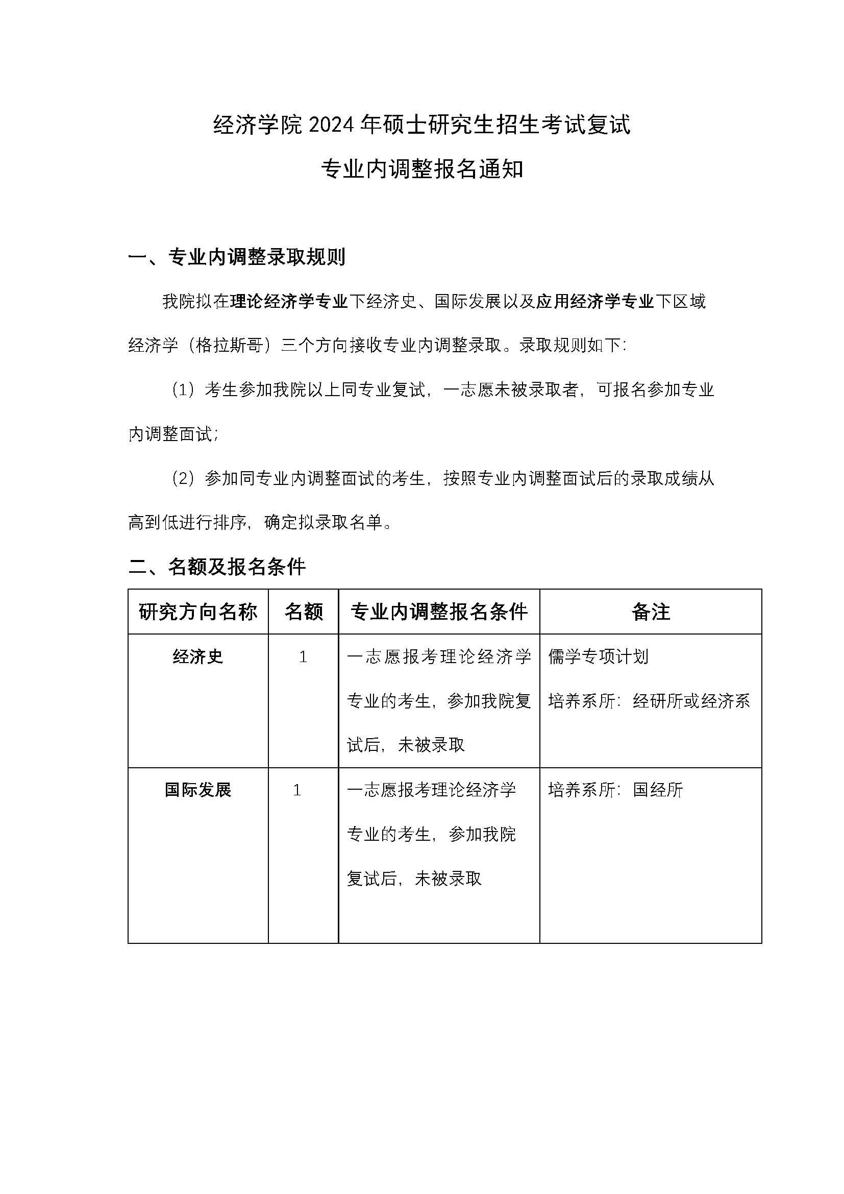 南开大学经济学院2024年硕士研究生招生考试复试专业内调整报名通知