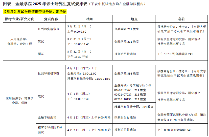 2. 复试时间:应用经济学金融学、金融工程3月31日,应用经济学精算学、金融和保险专硕4月1-2日。具体时间安排详见附表。请在规定的时间内报到,逾期未报到视为放弃复试资格。
